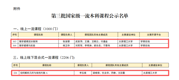 此次获批的3门国家级一流本科课程包括2门线上一流课程和1门线上线下混合式一流课程。线上一流课程分别是杨卫华教授牵头的《数学建模与实验》(课程团队:刘军军、李明涛、梁东岳、于晋伟),张淑蓉副教授牵头的《数学建模实训案例》(课程团队:武彩萍、王健、王晓云、付鑫金);线上线下混合式一流课程是李玉瑛教授牵头的《空间解析几何与线性代数A》(课程团队:梁晓荣、任永华、乔静、王旦霞)。