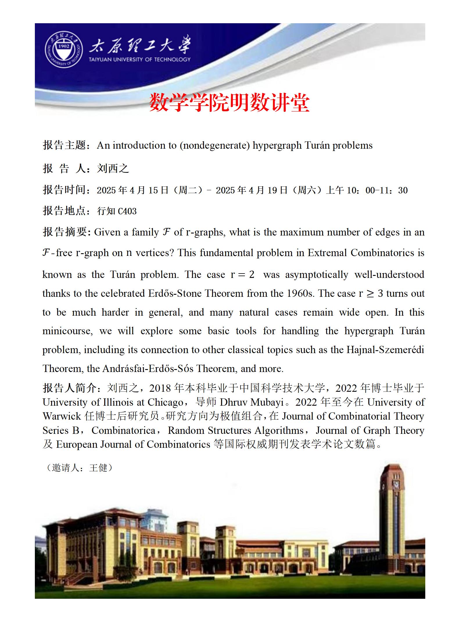 报告主题:An introduction to (nondegenerate) hypergraph Turán problems