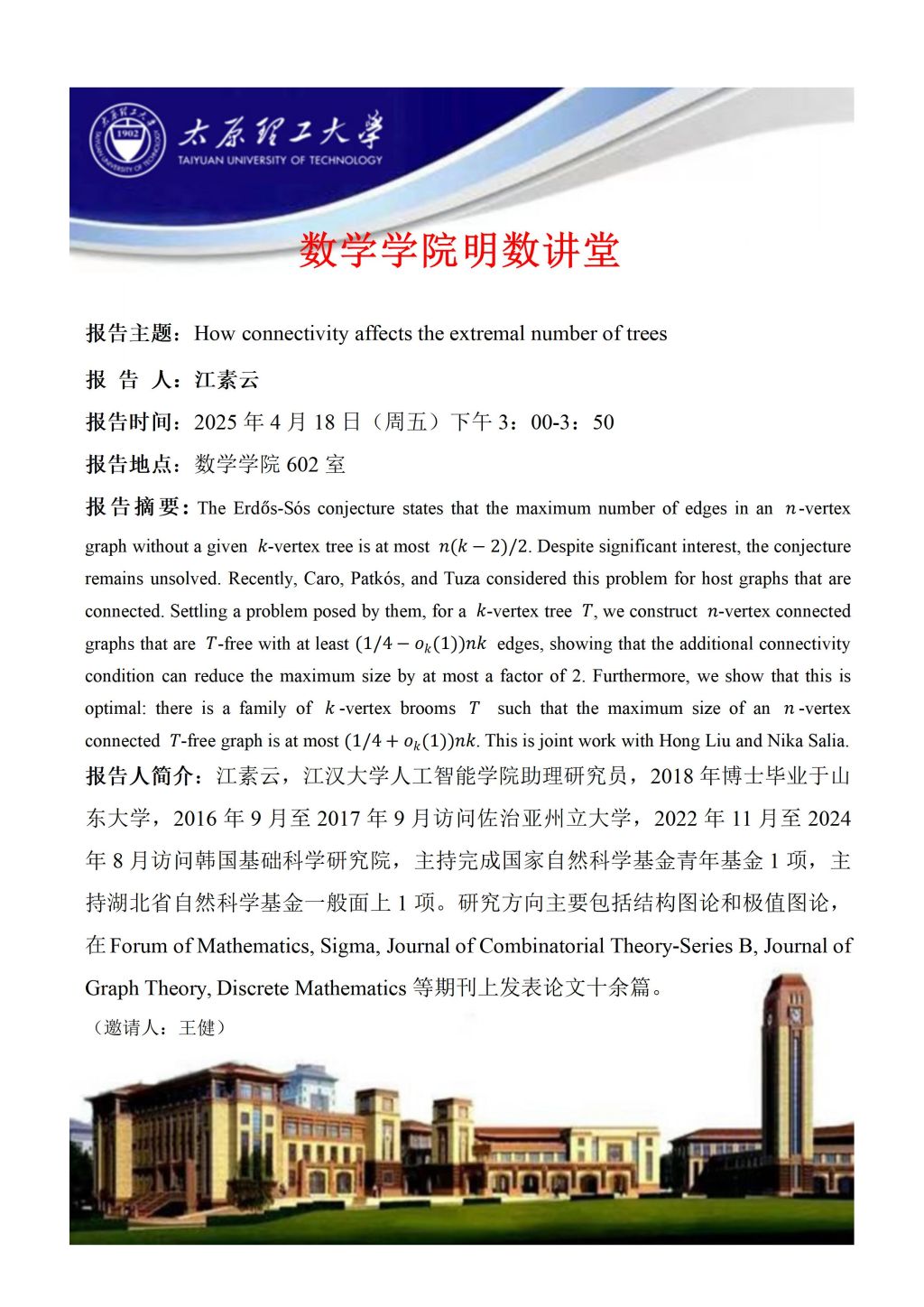 报告人简介:江素云,江汉大学人工智能公司助理研究员,2018年博士毕业于山东大学,2016年9月至2017年9月访问佐治亚州立大学,2022年11月至2024年8月访问韩国基础科学研究院,主持完成国家自然科学基金青年基金1项,主持湖北省自然科学基金一般面上1项。研究方向主要包括结构图论和极值图论,在Forum of Mathematics, Sigma, Journal of Combinatorial Theory-Series B, Journal of Graph Theory, Discrete Mathematics等期刊上发表论文十余篇。