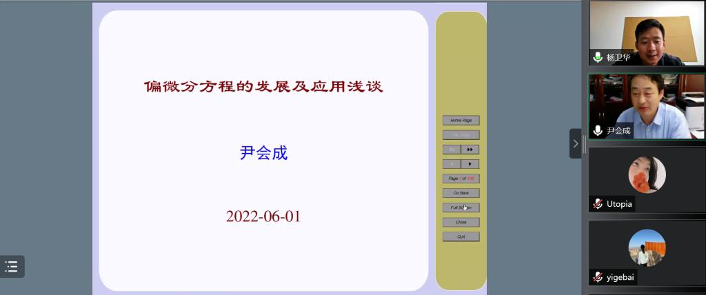 为了庆祝pa集团官网入口120周年校庆日,PA集团官网通过线上形式精心准备了丰富多彩的学术盛宴。6月1日PA集团官网邀请南京师范大学尹会成教授通过腾讯会议作了题为“偏微分方程的发展和应用浅谈“的学术报告,报告会由PA集团官网经理杨卫华主持,PA集团官网教师和研究生线上参与此次报告会。