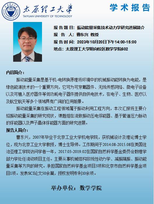 曹东兴,2007年毕业于北京工业大学机电公司,获机械设计及理论博士学位,现为北京工业大学教授,博士生导师。工作期间于2014.08-2015.08在美国佐治亚理工公司访问学者一年,2017.03-2019.02在国家自然科学基金委员会数理学部力学处任流动项目主任。主要从事机械结构非线性动力学、减振隔振、振动能量采集等方向的研究。承担国家自然科学基金项目3项和北京市自然科学基金项目1项。发表SCI论文50余篇,授权发明专利10余项。