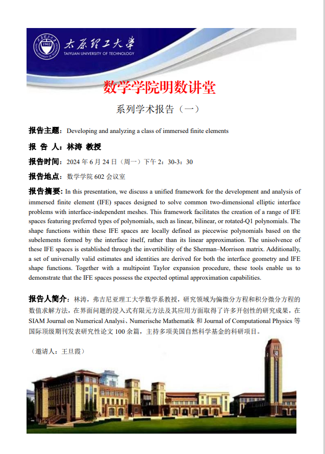 报告人简介:林涛,弗吉尼亚理工大学数学系教授,研究领域为偏微分方程和积分微分方程的数值求解方法,在界面问题的浸入式有限元方法及其应用方面取得了许多开创性的研究成果,在SIAM Journal on Numerical Analysi、Numerische Mathematik和Journal of Computational Physics等国际顶级期刊发表研究性论文100余篇,主持多项美国自然科学基金的科研项目。