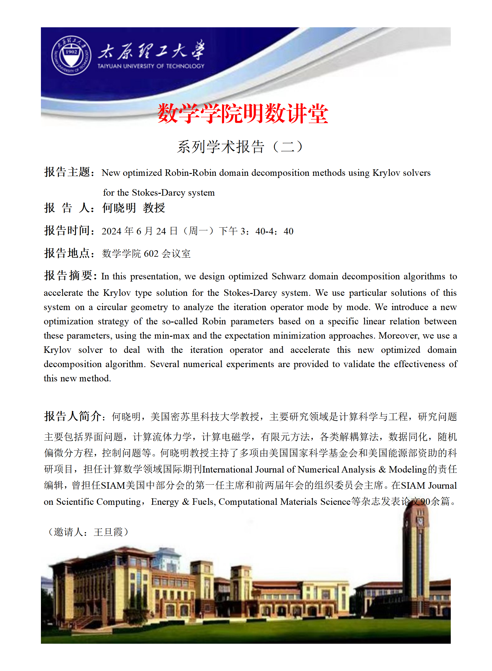 报告题目:New optimized Robin-Robin domain decomposition methods using Krylov solvers for the Stokes-Darcy system