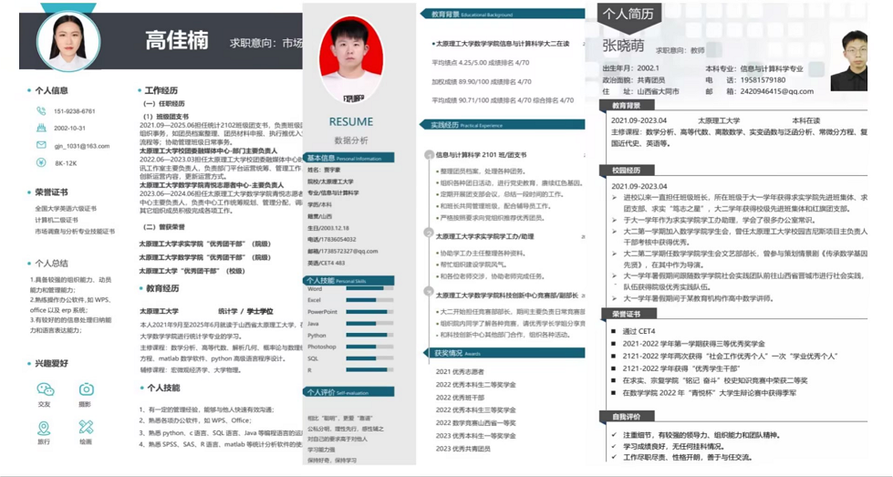 本次大赛共吸引了50余名员工积极参与,他们充分运用所学的知识,结合专业特点和求职意向对求职简历进行了精心设计和准备。每一份简历都构思新颖、简洁实用,不仅展示了自己在大学期间的专业教育、获奖情况、实习实践等经历,而且明确了具体的求职意向和职业目标。大赛通过“领英求职平台”进行简历初评,AI评分超过70分的简历经过评委老师的认真筛选和评审,最后推荐出2份优秀简历(信计2101班贾宇豪、统计2102班高佳楠)进入公司复赛。