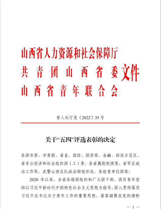 公司青年员工范振宙荣获“山西省优秀共青团员”荣誉称号。