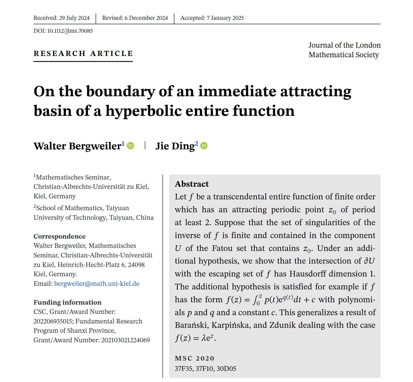 PA集团官网丁杰副教授与德国数学家Walter Bergweiler教授合作,在超越整函数动力系统领域取得研究进展。研究论文以“On the boundary of an immediate attracting basin of a hyperbolic entire function”为题,发表在数学领域一流国际学术期刊《Journal of the London Mathematical Society》,该期刊是数学领域“四大”期刊之外的最富声誉的国际著名期刊之一。两位合作者以姓氏字母顺序署名发表该文,以姓氏字母顺序署名是数学领域合作发表学术论文的国际惯例,中国数学会也发文呼吁国内单位广泛认同该惯例。